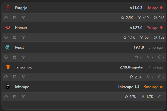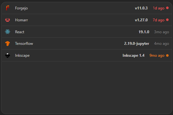 The releases widget enables you to track a list of repositories and see their respective latest release. It also supports importing releases from your local docker containers.